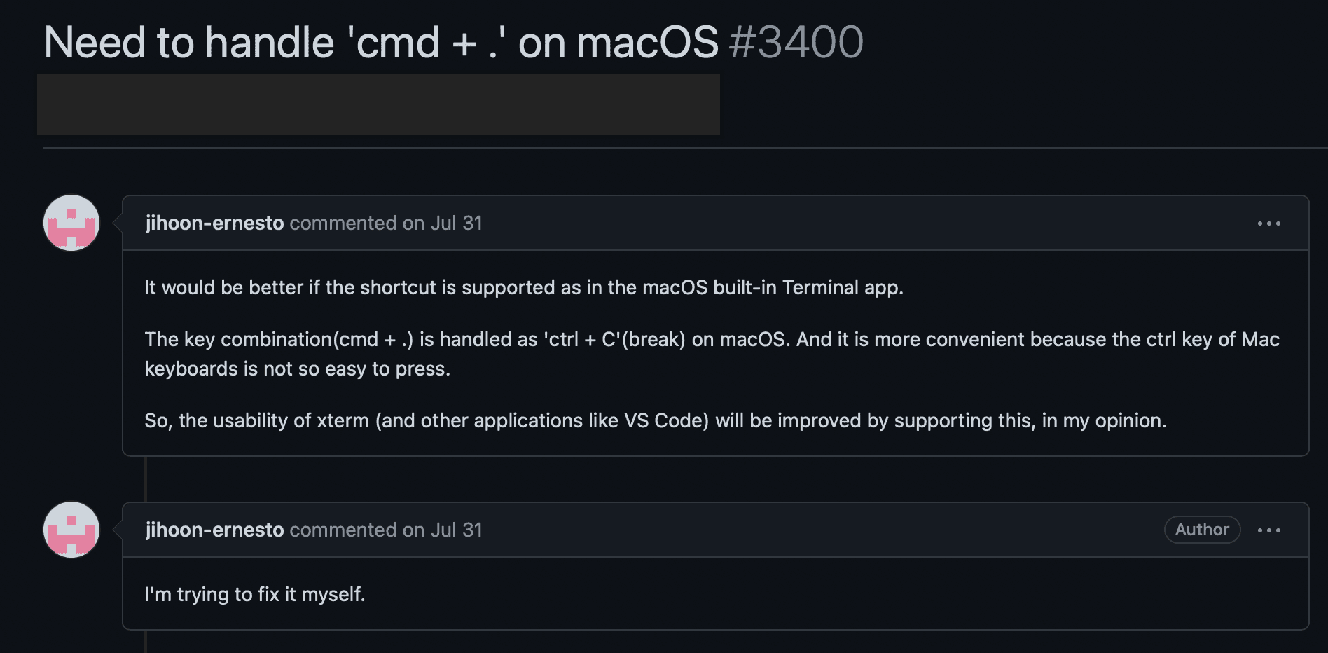 회사 프로젝트 작업할 때 GitLab의 Merge Request 만드는 거랑 같겠지만, 그래도 혹시 몰라 xterm의 안내 페이지를 여러 번 참고해보았다. 내 딴에는 잘 한다고 수정해서 올려도, 그쪽 규칙에 안 맞는다거나 하면 안 되니까. Contributing 페이지에 뭐라고 써있나. 일단 이슈를 하나 등록하고(JIRA 이슈 같은 거겠지), 그것을 내가 고치겠다고 명시하고, 그 다음에 PR을 올리면 되는 것 같았다. 맞다, 설마 이 커맨드 쩜 단축키에 관한 이슈가 이미 올라와있거나 하진 않겠지? 기존 이슈들을 쭉 둘러본 결과 그렇지는 않았다. 좋다. 그럼 이슈를 등록하자. 커맨드 쩜 단축키가 왜 필요한지 나름대로 간단명료하게 쓰려고 노력했다.